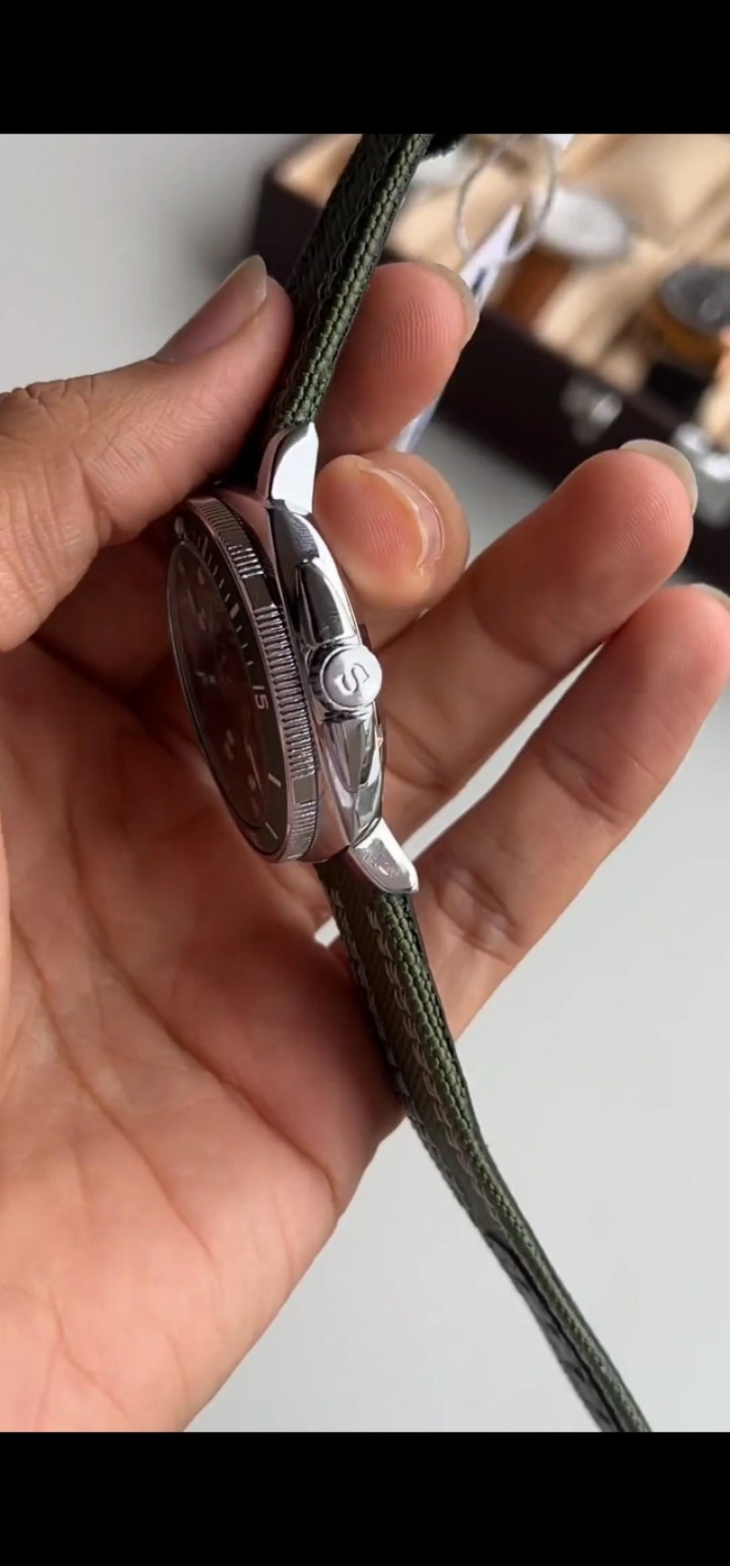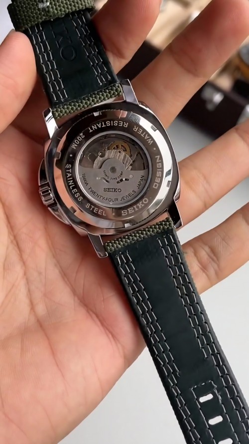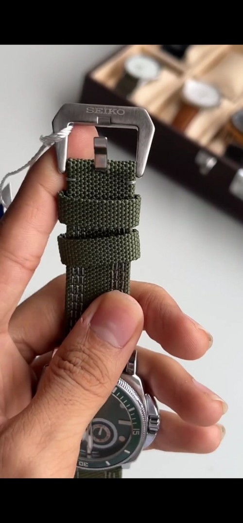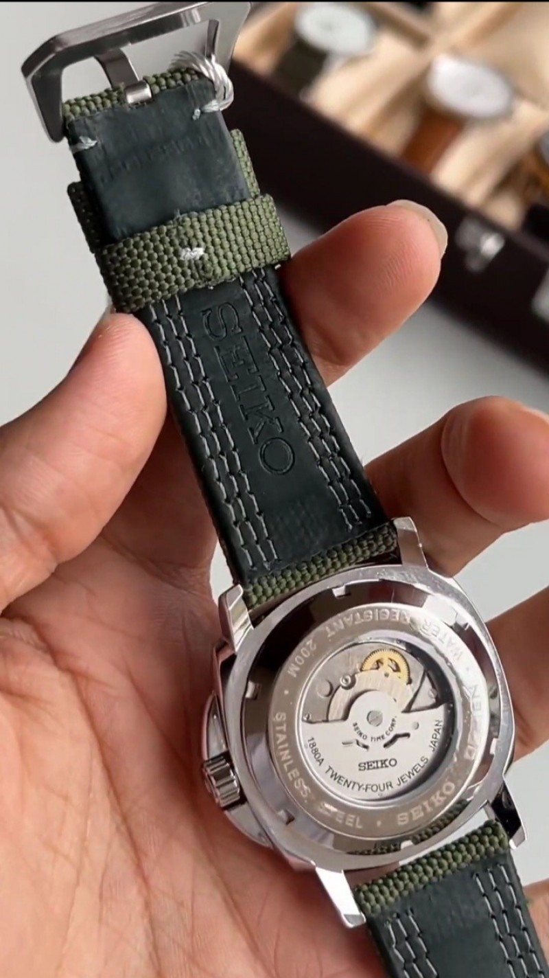 Seiko 5 Sports watch with a green fabric strap and a green dial. The watch features a stainless steel case and luminous hands and markers. The watch also has an open heart design, showcasing the automatic movement.